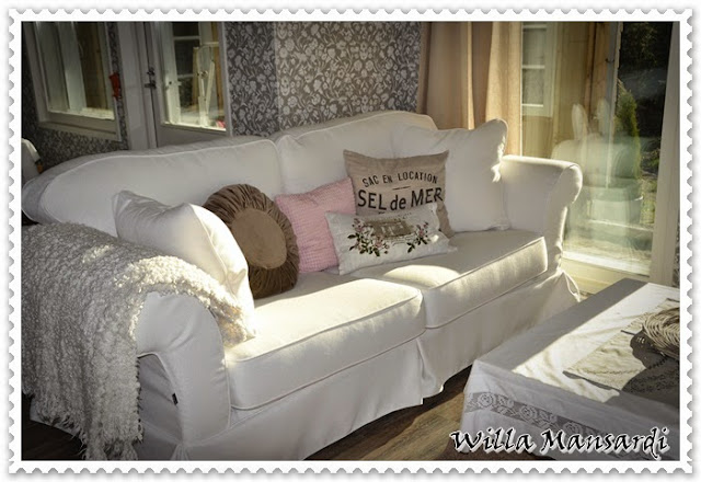 Ja lopultakin eilen sain nuo muhkeat sohvat olkkariin. Saa nähdä kuinka usein niitä saa olla pesemässä ja kuinka kovasti niitä tarvii varjella, mutta onpahan ainakin hienot! Sopivasti voi lapset vaikka ruokapöydästä juosta vähän sohvalle pyyhkimään suutaan... Voi olla, että tulee vieraittenkin lapsia jokusen kerran komenneltua pesulle, kun meillä leikkivät. :D